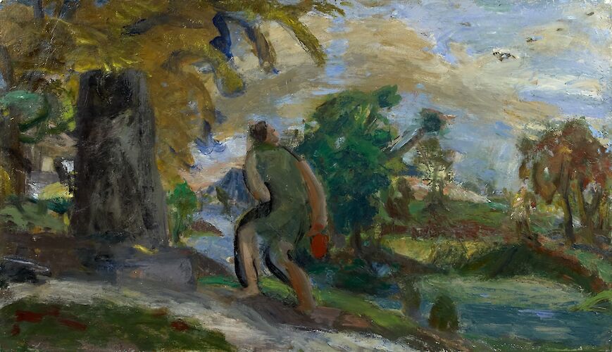 In "Orestes as Wanderer" (48” x 72”), the weather, the light at the time of day and year, and the landscape forms are painterly manifestations of the energy of the conflicting sanctions of the gods which propel Orestes onwards to his act of revenge. The paint itself drives the narrative which, as in the Aeschylus's works, finds its tragic force in the no-win situation for the protagonist and in the imposition of the wills of the Gods over humanity that both deforms and uplifts. It is that simultaneity that Martin's painting captures at the edge of abstraction and representation.