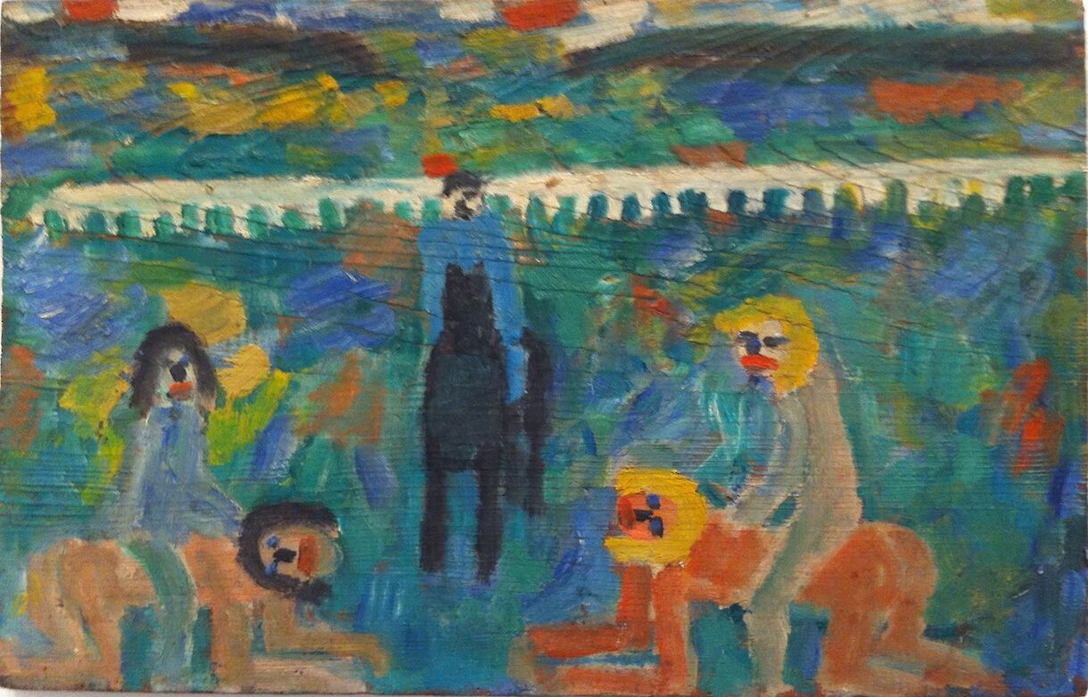 The dark stripes of the distant mountains gently narrow toward the blue rider. The verticals of his dark horse continue the weaving of this curvilinear move. The interrupted horizontals and mountain contours emphasize the blue rider as the focal point of the painting. He seems to cast his glance convincingly past the mock rider to the open field on the right. This tightly woven landscape with figures is filled with sensitive touches. It recalls Cezanne’s painting of Aix-en-Provence.