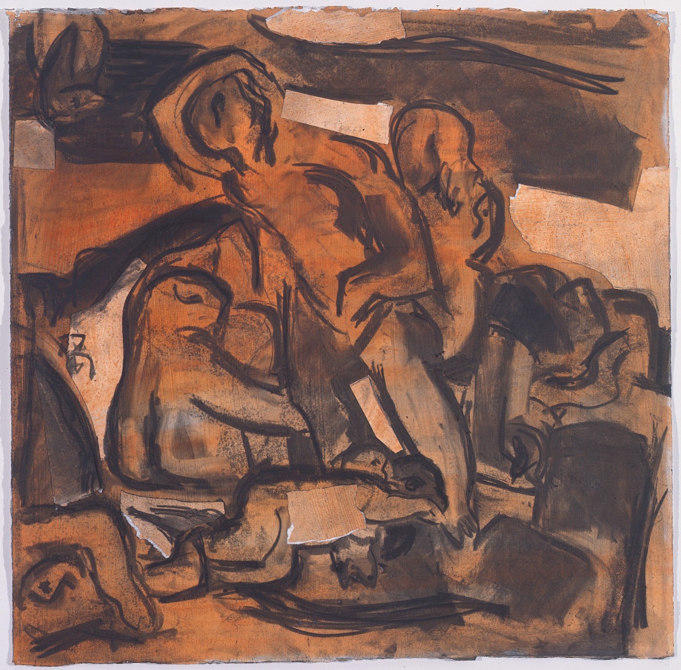 Within Younghee’s imagery, allusive narratives exist among theatrical scenes, and the layers of reference range from the literary and specific—for example, Eliot’s Tiresias and Philomel appear in many compositions—to the personally mythic and mysterious. She presents us with emblematic personages such as the classically standing man, or seated woman, and the archetypical child with outstretched arms. Younghee’s paintings achieve the intensity of the emotions, thus translating Eliot’s enigmatic poem into a new, yet timeless, form.
